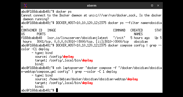 docker compose run --rm --name quartz-dev --service-ports quartz-devTo add convenience into the webtop container. I’ve created deploy and dev in obsidian-webtop/ which are simply wrappers for deploy.sh and dev.sh and SSH, then I used bind mount to ./deploy:/config/.local/bin, so these scripts are in the container’s shell PATH, and I can simply type deploy to execute the desired script over SSH. Similarly, in obsidian-shell, the command for deployment is much easier. Here’s the original Powershell script