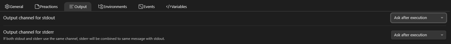 Under Output, make sure Ask after execution is selected for both stdout and stderr so a modal will show when the command is executed.
