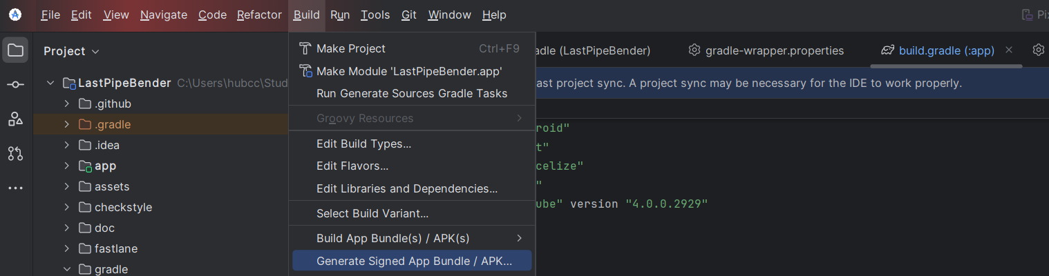 Go to hamburger menu > Build > Build Signed App Bundle/APK
